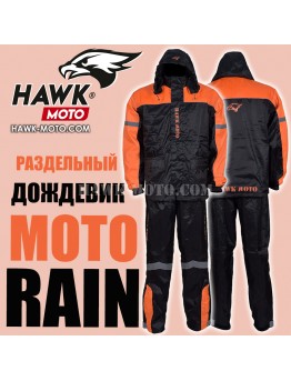 Раздельный мотодождевик от HAWK MOTO это: - Удобная конструкция с одной большой застёжкой - "молнией" на груди с андидождевым клапаном на "липучке". - Мягкая нейлоновая подкладка, которая не даёт телу соприкасаться с холодным внешним слоем во время дождя. - Удобные внешние карманы с антидождевым клапаном. - Отражающие элементы на рукавах и штанинах. - Удобные раструбы штанин на застёжке для надевания поверх мотобот. - Широкая форма дождевика для надевания на одежду. - "Затяжки" - для регулировки плотности прилегания.